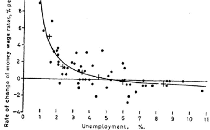 where π^e represents expected inflation, π* represents the target inflation rate, µ represents unemployment, µ* represents the natural rate of unemployment, and α is the slope of the Phillips curve (PC). So, PC suggests that there is a trade-off between inflation and unemployment.